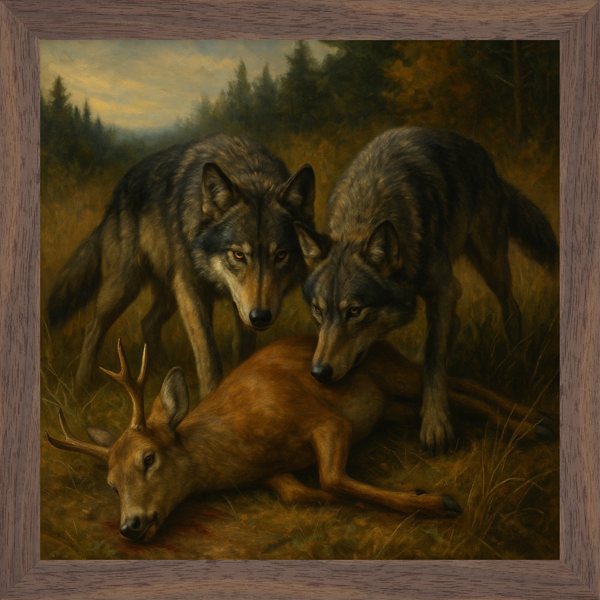 Bring raw power and natural harmony into your home with The Wild Balance, a breathtaking wildlife art print that captures the eternal rhythm of predator and prey in nature’s cycle. Two wolves, rendered in lifelike detail, stand over a fallen deer amidst a misty forest clearing — a moment both haunting and profoundly beautiful.
